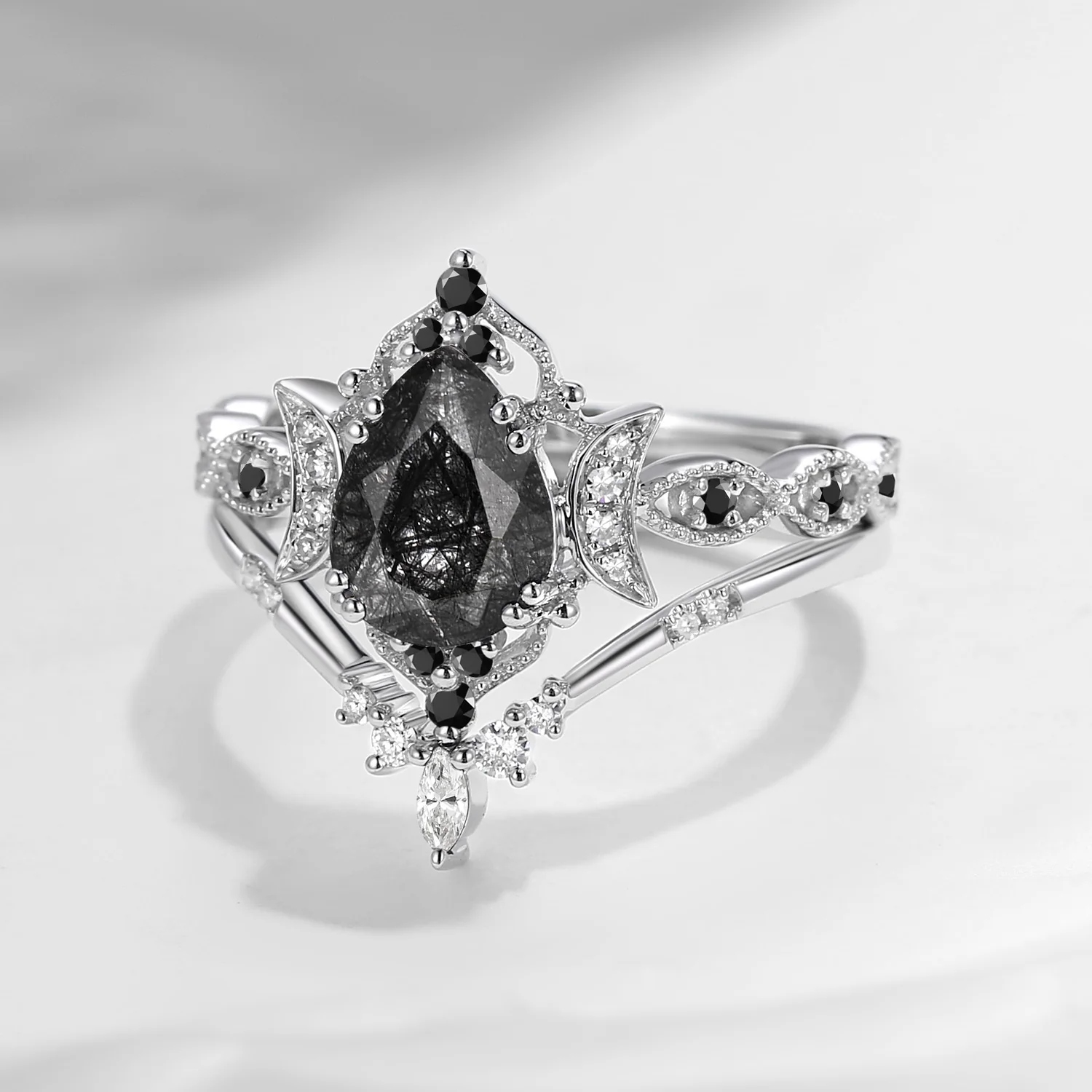 Crescent Moon | 18K Antique Pear Cut Black Rutilated Quartz Engagement Ring Set 2pcs - Dark Moon