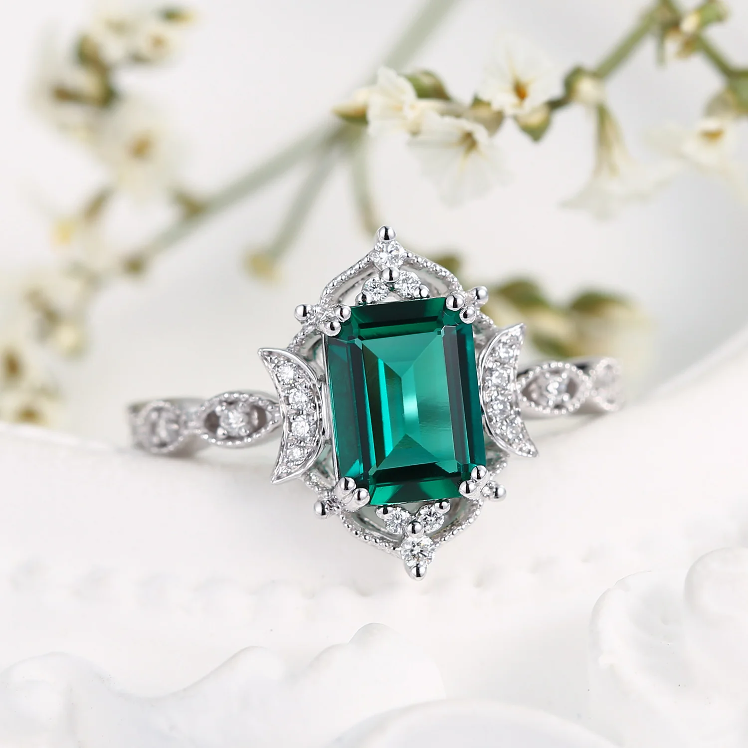 Crescent Moon | Art Deco Emerald Cut Lab Emerald Engagement Ring
