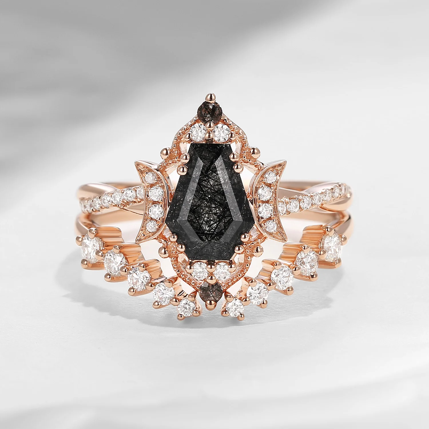 Crescent Moon | Coffin Cut Black Rutilated Quartz Engagement Ring Set 2pcs - Infinity Galaxy
