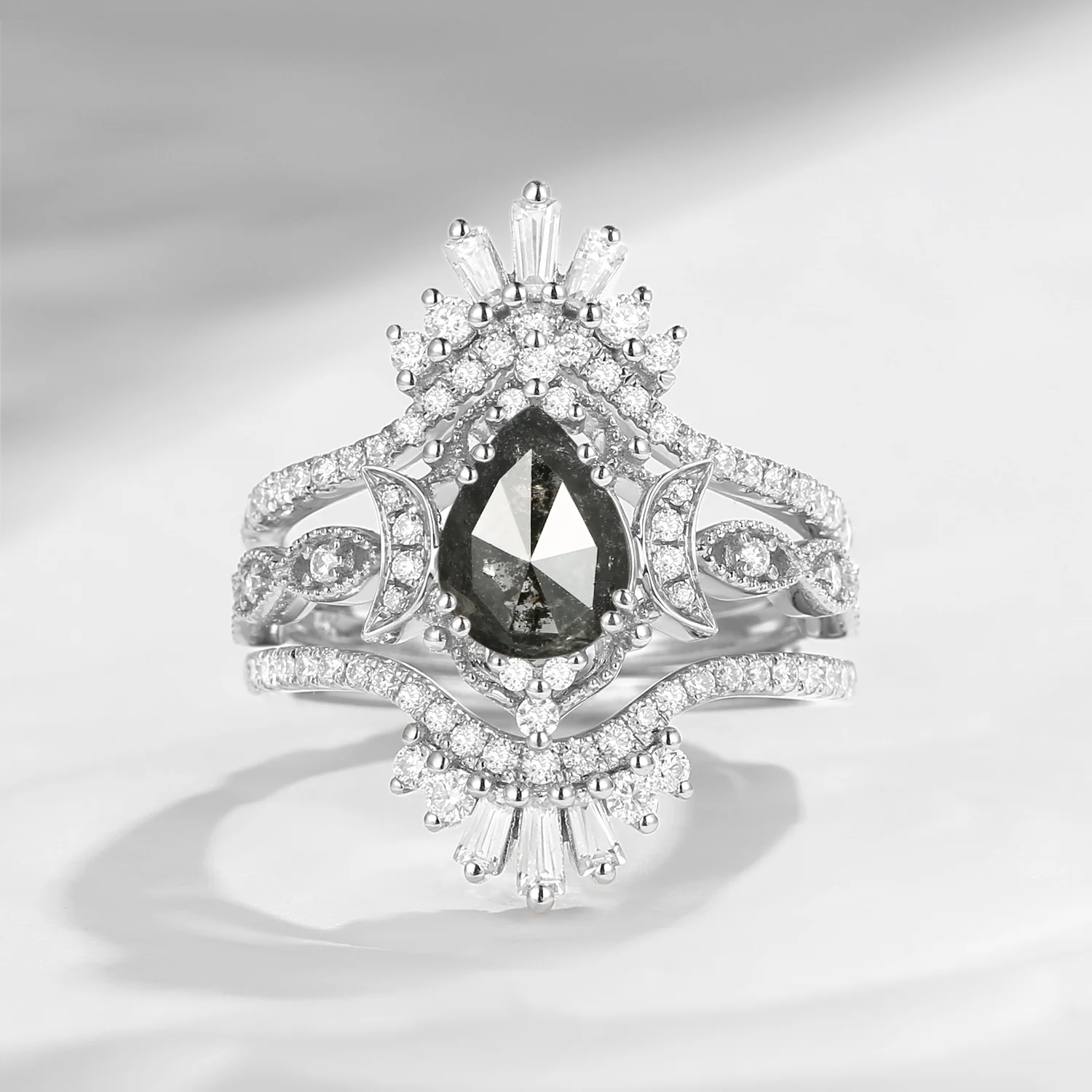 Crescent Moon | Maximalist Style Pear Shaped Salt And Pepper Diamond Engagement Ring 3pcs