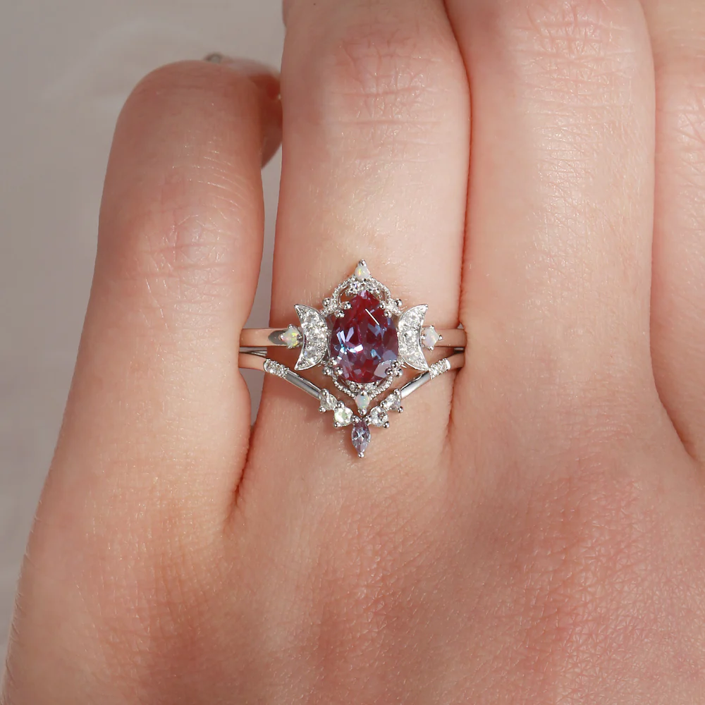 Crescent Moon | Pear Cut Alexandrite Moonstone Opal Engagement Ring Set 2pcs 18k