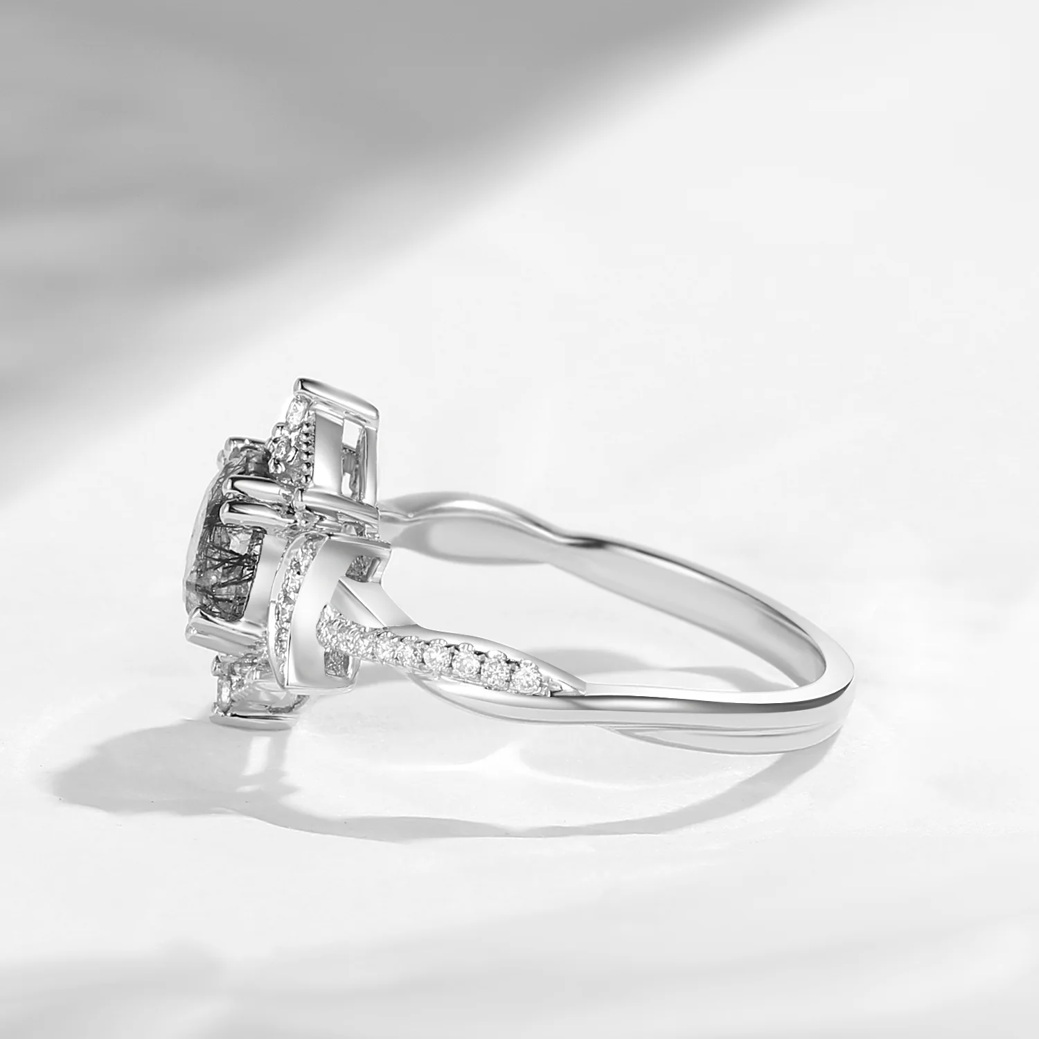 Infinity Crystal Ring Black Rutilated Quartz Engagement Ring Black Vintage Style Wedding Ring Gift For Her Cluster Star Brilliant Round