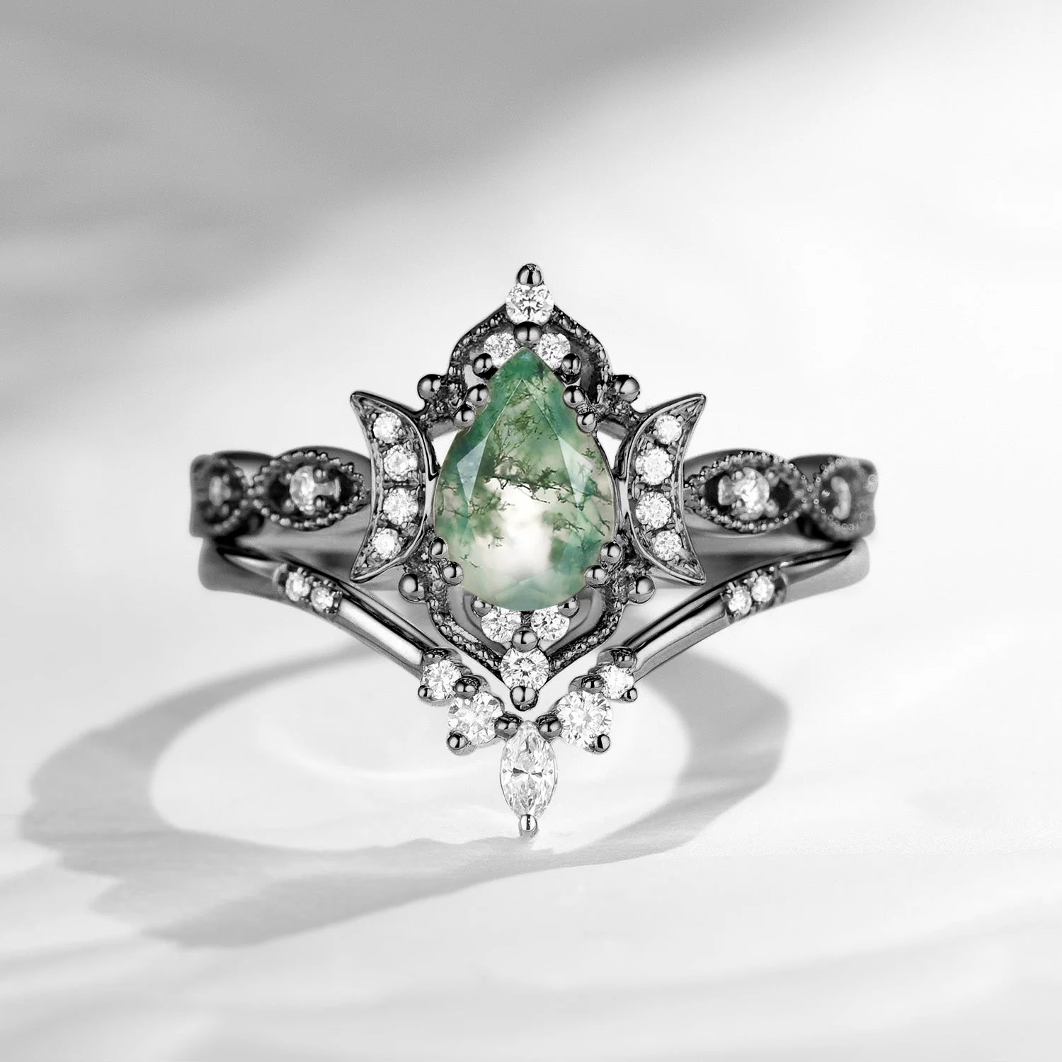 Crescent Moon | Unique Pear Shape Moss Agate Black Gold Engagement Ring Set 2pcs - Luna