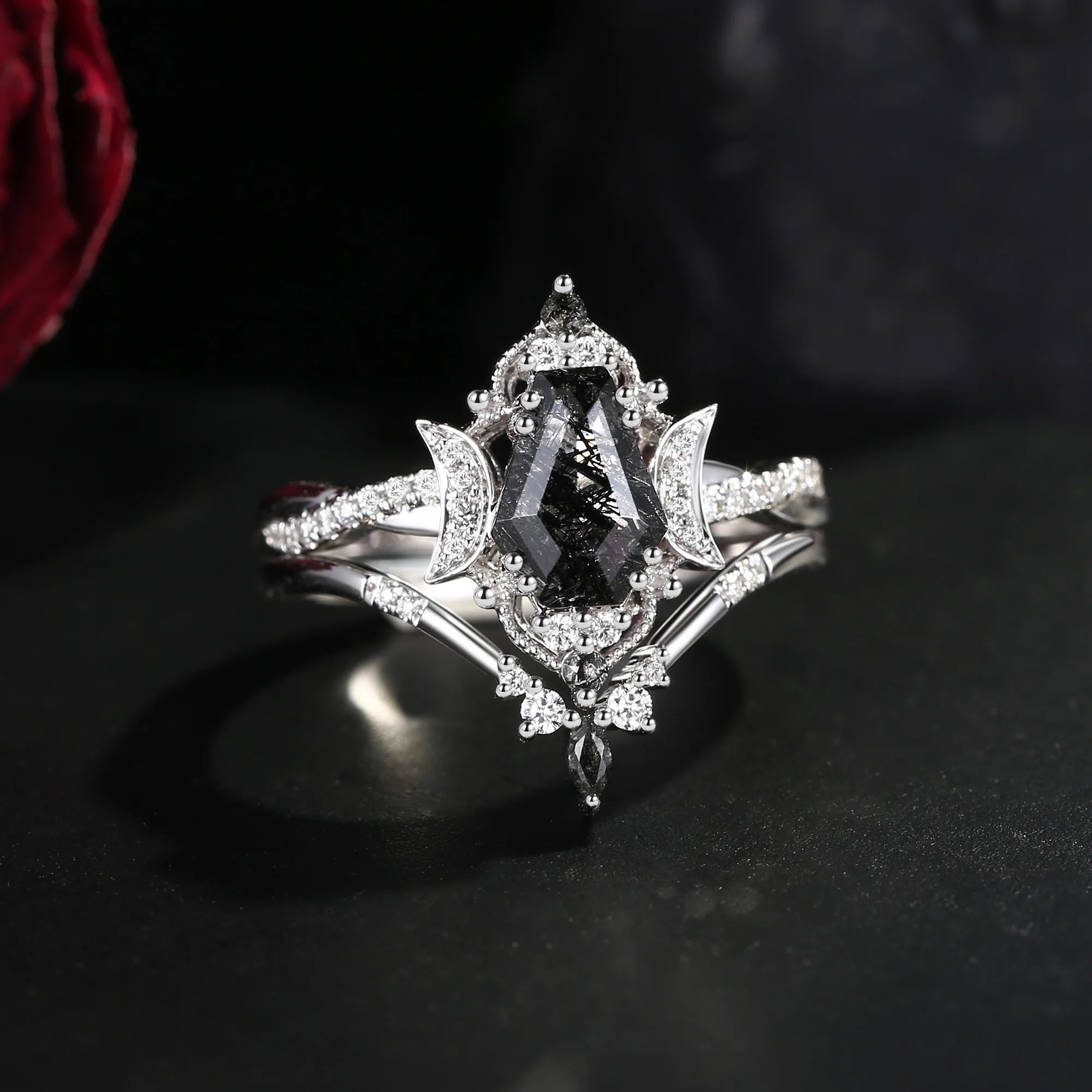 Crescent Moon | Vintage Inspired Infinity Coffin Black Rutilated Quartz Engagement Ring Set 2PCS - Alexandria