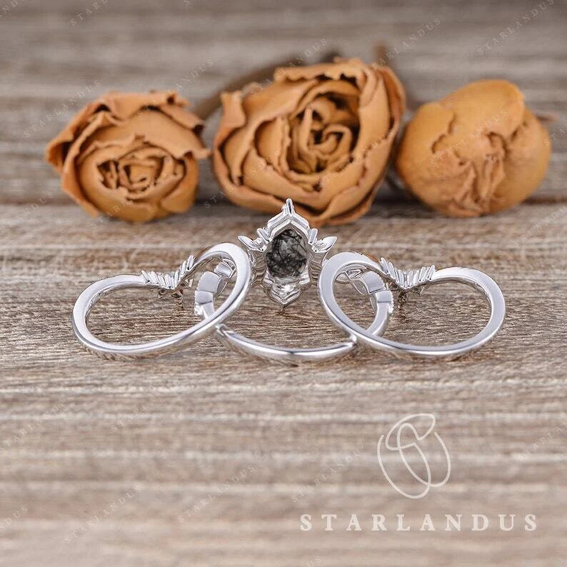 Crescent moon | Vintage Inspired Oval Cut And Marquise Black Rutilated Quartz Ring Set 3PCS