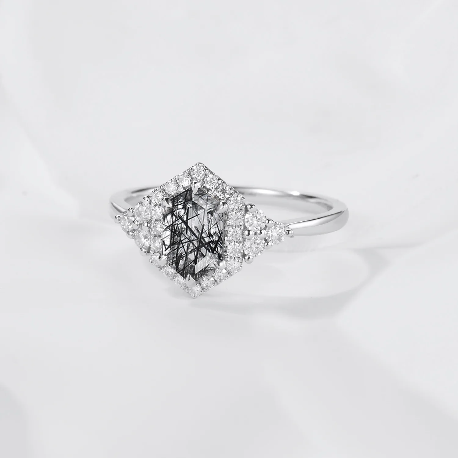 Cluster Engagement Ring White Gold Hexagon Black Rutilated Quartz White Gold Engagement Ring Women Solitaire Geometric